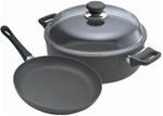 3-piece cookware set. The set consists of: 9-inch skillet; 9-inch low Dutch oven; glass lid. 3 pieces total.